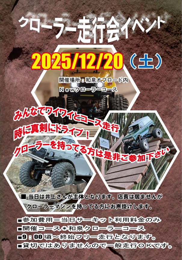 ★2025/12/20(土)クローラー走行会を行います。(開催終了)気軽に自由参加、自由走行となります、当日はクローラーマシンを持って和泉オフロードサーキット内、クローラーコースにお集まり下さい。大凡9:00~終日楽しめるまでです。途中参加、途中退場自由です。*参加費はありませんが、和泉オフロードサーキット会員でのご利用料金が掛かります。*エントリーは必要ありません、当日サーキットにお集まり下さい。当日は店長ではなく、井上さんが仕切りますのでお声掛け下さい。